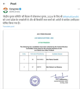 According to sources on 20th may in the fifth round of seven-phase process,Today,Both Rahul Gandhi and KL Sharma will file their nominations and the last day for the same. Talking about X, Handel Congress said that the decision to field Rahul Gandhi from Raebareli and KL Sharma from Amethi was made at a meeting of the ‘Central Election Committee’.