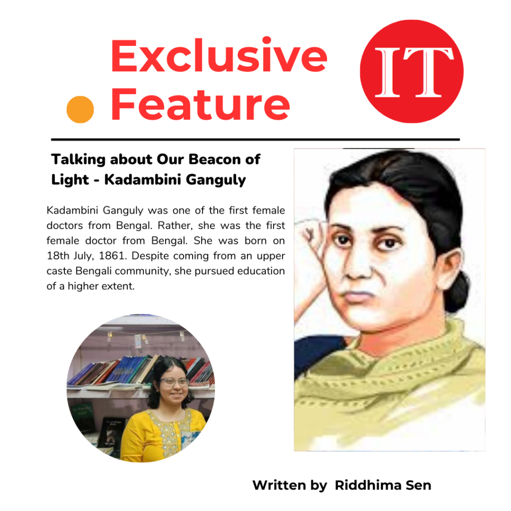 Kadambini Ganguly was one of the first female doctors from Bengal. Rather, she was the first female doctor from Bengal. She was born on 18th July, 1861. Despite coming from an upper caste Bengali community, she pursued education of a higher extent. She received her initial education at Brahmo Eden Female School, Dacca. Subsequently, she received education at Hindu Mahila Vidyalaya, Ballygunj Calcutta. In 1878, she became the first woman to pass the University of Calcutta entrance examination. She passed the FA exam in 1880. Along with Chandramukhi Basu, she became the first graduate from Bethune College.