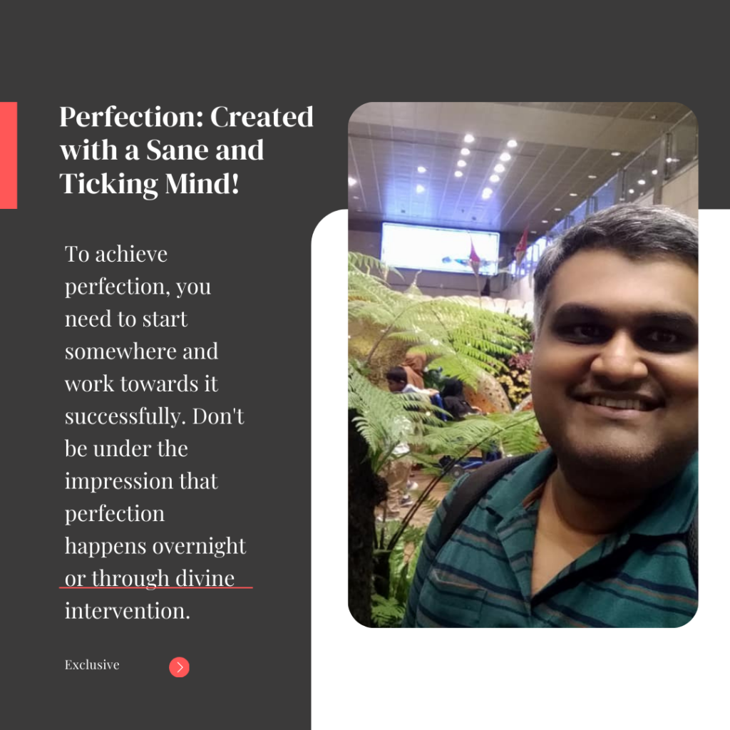 To achieve perfection, you need to start somewhere and work towards it successfully. Don’t be under the impression that perfection happens overnight or through divine intervention. It’s a combination of relentless pursuit of improvement, a little luck, belief in the divine and the never-say-die spirit. Anything else is a complete mystery with cacophony as a friend.